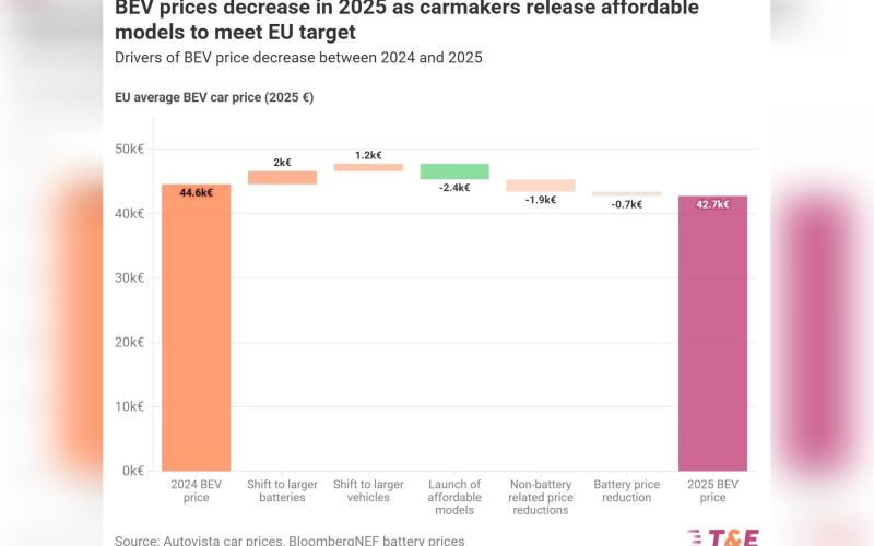 The average price of electric cars in the European Union fell in 2025 for the first time since 2020, according to a new analysis by Transport & Environment (T&E). The decline has been attributed to the launch of more affordable electric vehicle models as carmakers move to comply with the bloc’s vehicle CO₂ emissions targets.