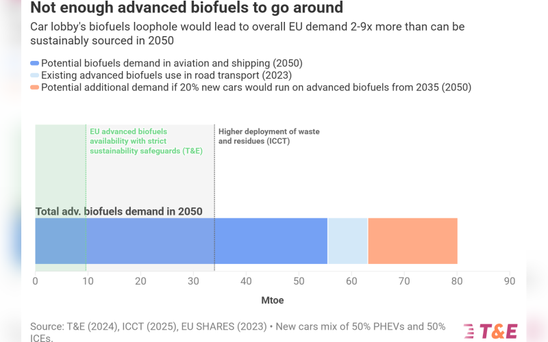 The EU is under mounting pressure from parts of the fuels and automotive industries — backed by the Italian government — to permit new internal combustion engines fuelled by biofuels beyond the 2035 deadline. Critics warn this would divert limited advanced biofuels away from hard-to-decarbonise sectors such as aviation and shipping, which already face a substantial supply shortfall. Under current EU targets, demand from planes and ships alone is projected to require roughly twice the sustainably available advanced biofuel supply in 2050, even under the most optimistic scenarios.