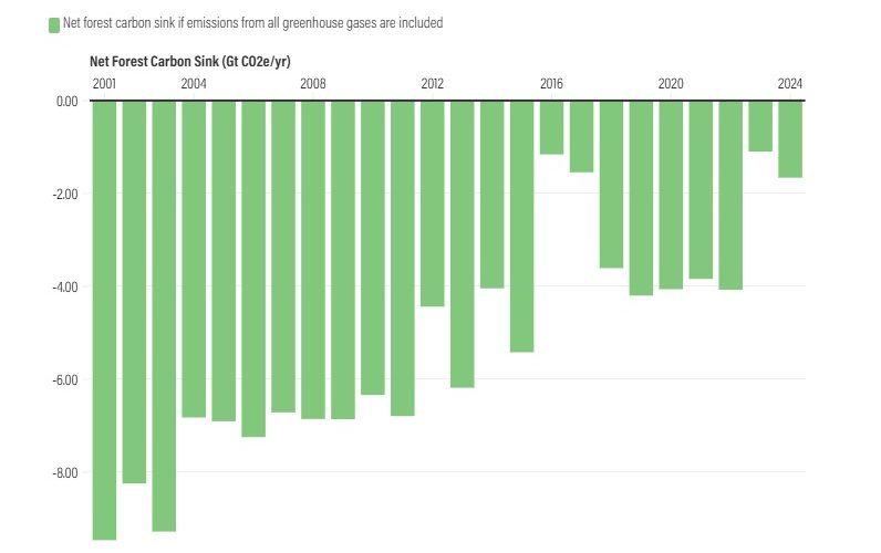 This alarming dip is part of a broader trend, with deforestation, forest degradation, and climate-related stressors undermining forests’ ability to serve as net carbon sinks. The gap between emissions from forest loss and the carbon removed by standing and regrowing forests is narrowing, raising fears that forests may soon become net carbon sources.
