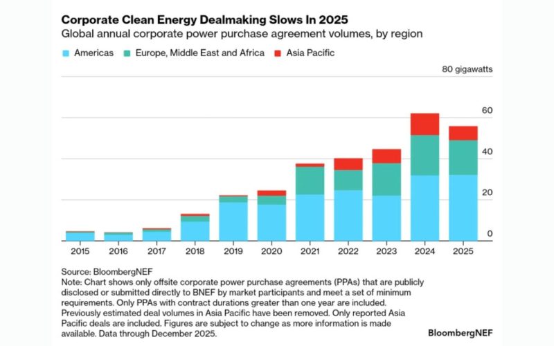 Corporates announced 55.9 gigawatts (GW) of clean power deals in 2025, down 10% from the previous year’s record, BNEF said in its 1H 2026 Corporate Energy Market Outlook.