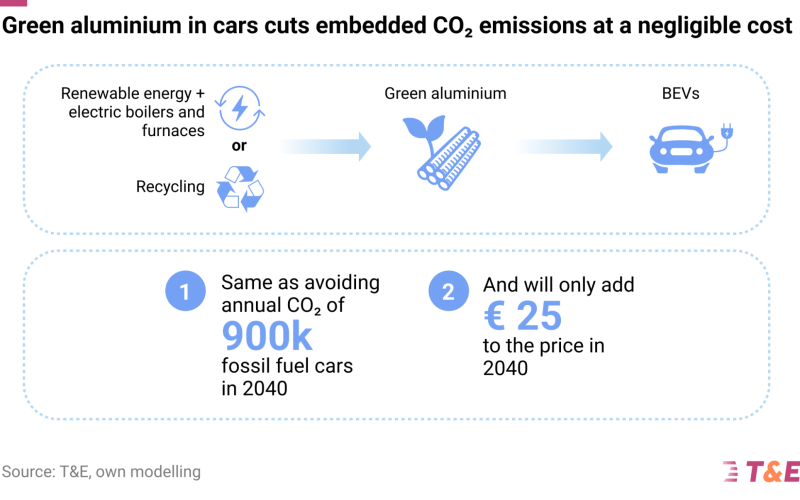 Green aluminium includes recycled aluminium and primary aluminium produced using electrified heating and emerging low-carbon technologies. T&E argues that wider adoption would sharply reduce emissions linked to EV production.