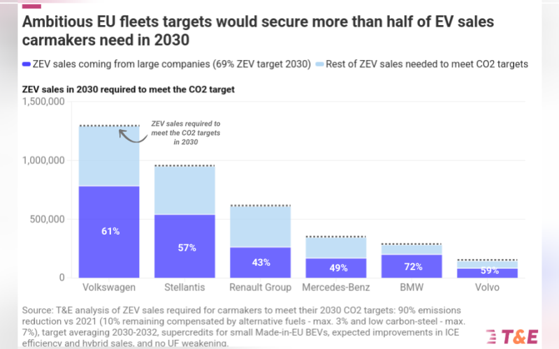 A proposed EU law requiring large companies to electrify their vehicle fleets could deliver more than half of the electric vehicle (EV) sales needed for carmakers to meet their 2030 CO₂ targets, according to new research by Transport & Environment (T&E).