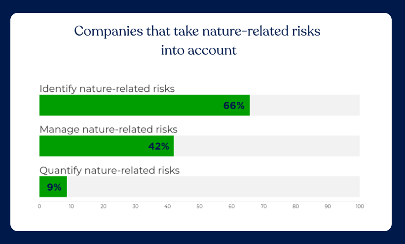 Among the 750 largest companies operating in high-impact sectors such as food, mining and paper, only 14% measure their dependence on ecosystem services. Around 34% show evidence of managing nature-related risks, including through biodiversity assessments, water-reuse systems and regenerative agriculture. However, just 9% quantify the potential financial or operational impacts, and only 4% assess opportunities linked to healthier ecosystems.